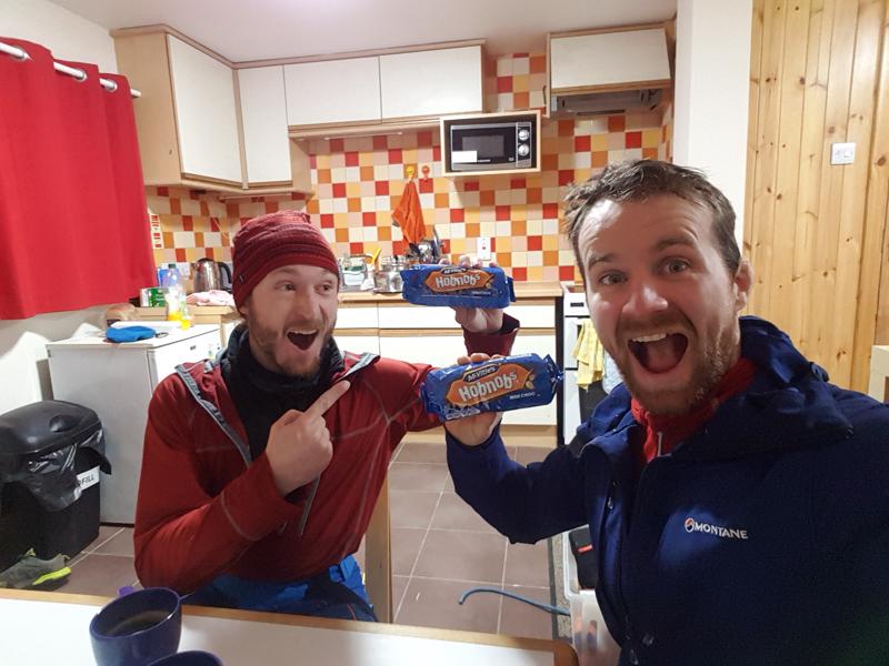 We headed down from the last summit towards the Steall Falls and the wire bridge. Unfortunately the first river from the falls was in spate so we had to wade across with our boots around our necks. After much procrastinating I took the plunge and found myself up to my thighs in icy water with Matt following me through. My legs instantly got the hot aches and it took a few minutes for the pain to subside but I was eager to push on and grab these Hobnobs.