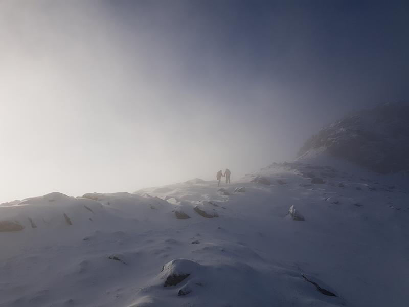 We arrived at the summit around two and a half hours after we left the car and were greeted by full on winter with strong icy winds and lots of blowing snow. After a few minutes taking it all in we checked the map and headed on a bearing to find the way off and back down to the car via the lost valley.