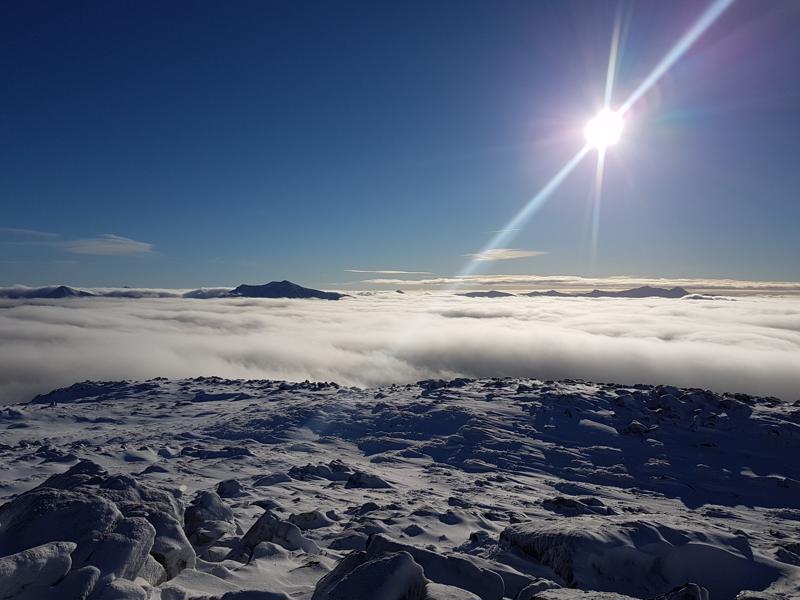 Reaching the summit was simply breath-taking. We stood on the cairn and looked around to see all the 900m+ peaks poking out of the clouds which looked like a see of mountains floating on the cloud tops. We stayed on the summit for quite a while and as the warm air was pushing over the cold front it was certainly warmer on the summit than in the valley.