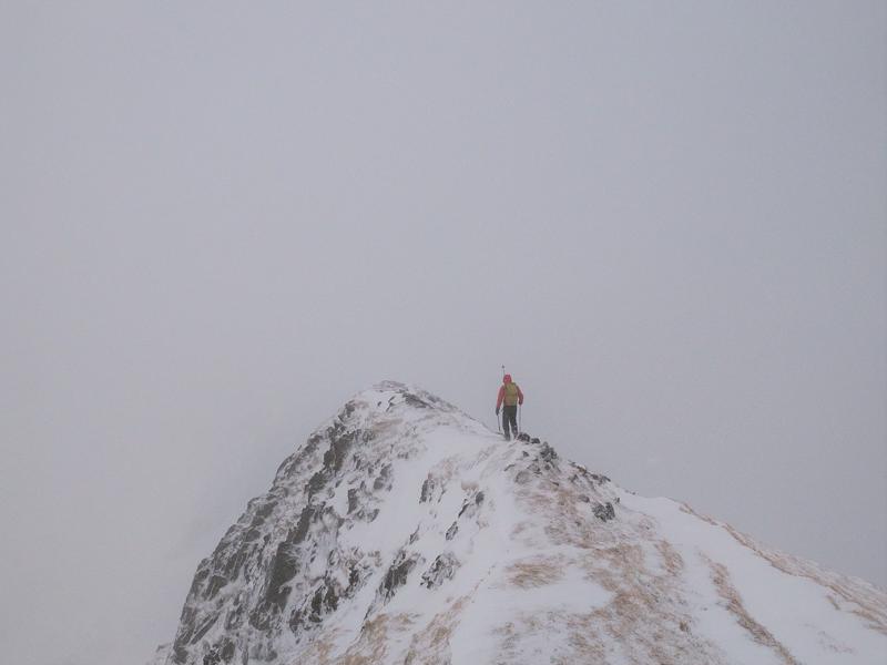 We reached the summit in good time but the combination of high wind speeds and freezing temperatures made the windchill exceptionally cold to any exposed skin. We didn’t hang around on the summit and after a short walk down some steeper ground we found ourselves on the exit point that we had spied from the bottom on the walk in.