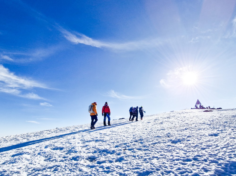 Walking under the stars, we watched the sunrise as we neared the 3,900m shoulder. The cold intensified, prompting us to layer up with heavier jackets and gloves for the final push. The ridge walk to the summit was a bit more tricky with the firm snow but our team made steady progress to the top.
